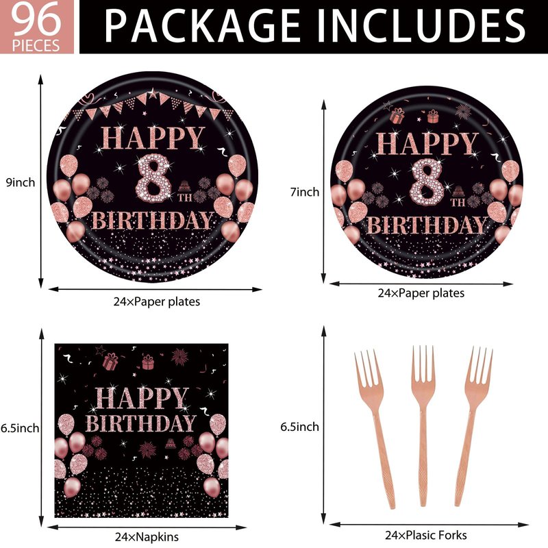 - 8th Birthday Party Supplies: This set includes 96 pieces to serve 24 guests.You'll receive 24 black and rose gold dinner plates(9in),24 dessert plates(7in),24 napkins(6.5in),and 24 plastic rose gold forks.Everything you need for a stylish celebration is in one package.