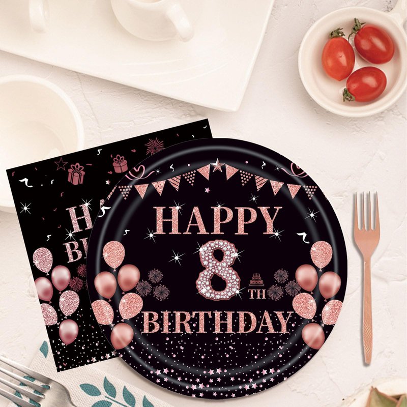 - Elegant Rose Gold Design: Featuring a sophisticated black background with rose gold accents with a bold "Happy 8th Birthday" font against a black background,these plates are adorned with elements like banner,balloons,pink diamonds.The beautiful and novel design creates a rich party ambiance that will impress your family and friends.