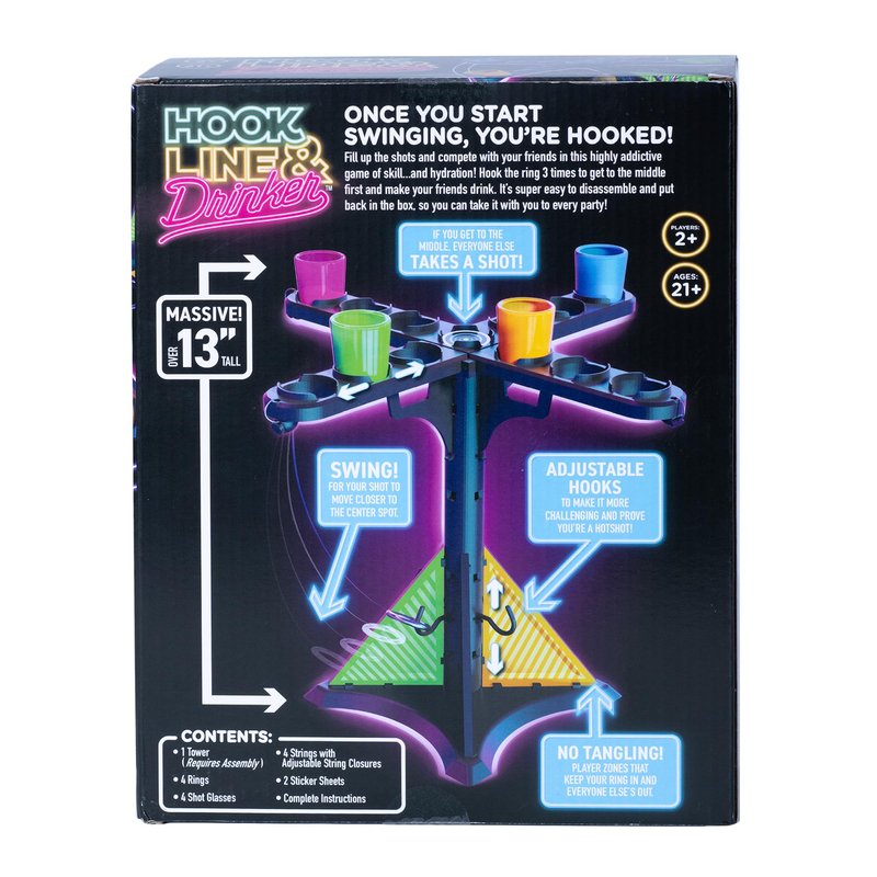 - Includes 1 Tower (1 Base, 4 Bumpers, 2 Poles, 1 Topper, 4 Arms, 4 Arm Supports, 4 Hooks), 4 Strings with Adjustable String Closures, 4 Rings, 4 Shot Glasses, 2 Sticker Sheets, and Complete Instructions