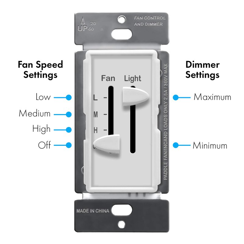 - Dual slide controls; Slider for fan is 3 speeds (not for variable type fans or remote controlled), slider for lights provides for smooth dimming with a noticeable click off when moving slider past the dimmest position