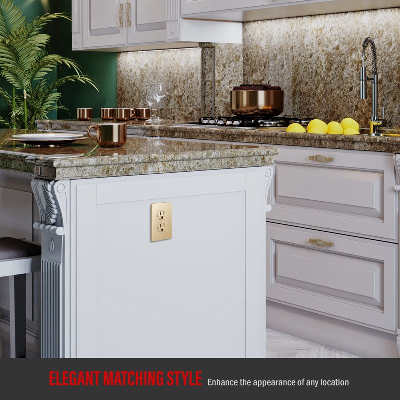 - Superior design tamper-resistant duplex outlet from our Elite Series; replaces any 1-gang in-wall electrical outlet; receptacle face has a soft metallic-colored finish; includes matching screwless wall plate (ENERLITES model SI8821-GD) with a child-safe design