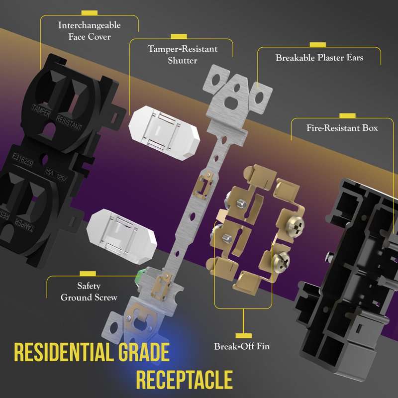 - Complies with 2017 NEC, Article 406.12 for tamper-resistant receptacles. 15A 125V, 5-15R, self-grounding, 2-pole, 3-Wire. UL94, V2 Rating, 1-year warranty, UL Listed