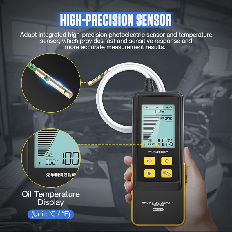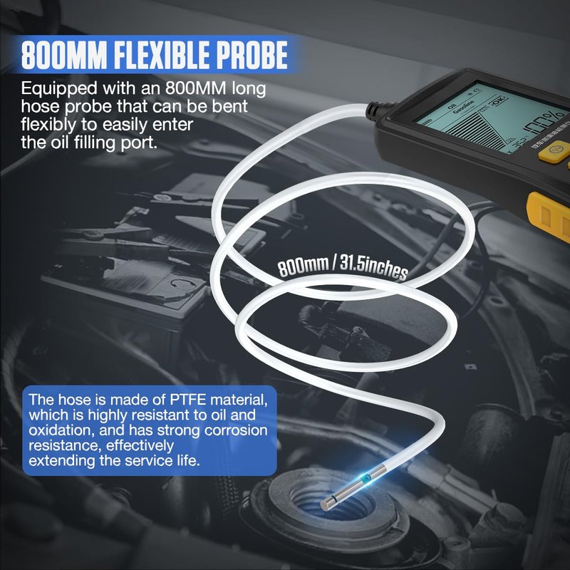 - 【High-precision Sensor & 800MM Flexible Probe】Engine oil tester probe adopts an integrated high-precision photoelectric sensor and temperature sensor,which provides fast and sensitive response and more accurate measurement results.It is equipped with an 800MM long hose probe that can be bent flexibly to easily enter the oil port. No need to take the oil out to test.The hose is made of PTFE material, which is highly resistant to oil, oxidation and corrosion,effectively extending its service life.