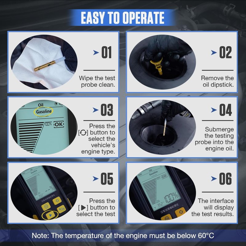 - 【Warmly Note】 1. Please check the temperature displayed on the dashboard of your car before testing. The engine temperature must be below 60°C during the test. 2. Please wipe the test probe clean before testing, and make sure the probe is immersed in oil during testing.