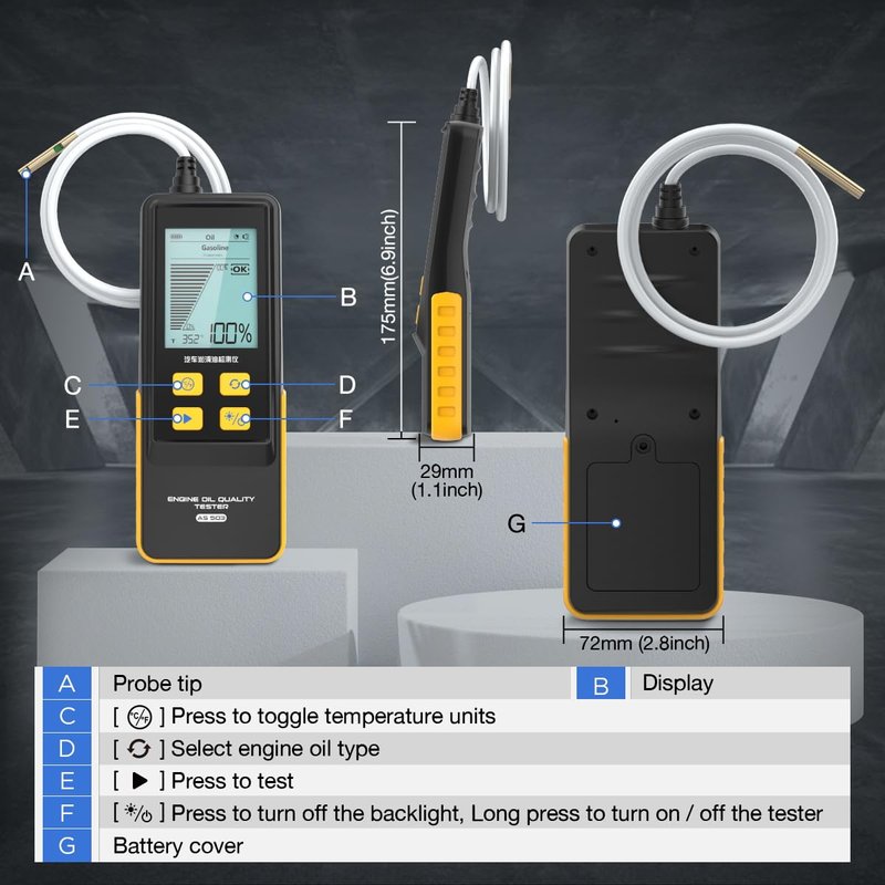 - 【Auto Power Off & User-friendly Handheld Design】If the engine oil tester is in a state of no operation, it will automatically power off after 5 minutes to help you save power. It is powered by 4pcs 1.5V AAA batteries(included). Engine oil quality tester is lightweight, and its handheld portion has a non-slip silicone design that provides excellent grip and facilitates one-handed operation.