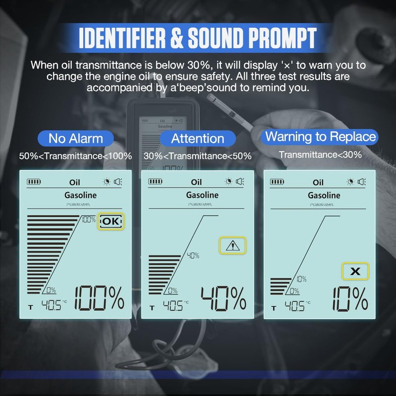 - 【Identifier & Sound Prompt】Engine oil analysis kit can generate a analog bar graph. When the engine oil transmittance is between 50% and 100%, the engine oil tester screen will display 'OK'. When oil transmittance is between 30% and 50%, an '!' will be displayed to remind you to pay attention. When oil transmittance is below 30%, engine oil quality tester will display '×' to warn you to change the engine oil to ensure safety.All three test results are accompanied by a‘beep’ sound to remind you.