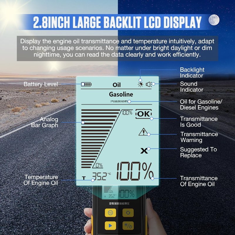 - 【2.8-inch LCD Display with Backlight】The engine oil analyzer is equipped with a large 2.8-inch high-definition LCD screen, which can intuitively display the engine oil transmittance and temperature, allowing you to view the test results at a glance. The engine oil tester has a backlit button that can be turned on with one click to adapt to changing usage scenarios. No matter under bright daylight or dim nighttime, you can read the data clearly and work efficiently.
