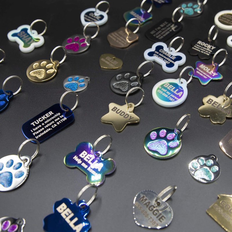 - When it comes to long-lasting durability our 100% solid stainless steel pet tags can withstand the most active dog or cat.The permanent laser engraving is clear to read on an attractive, polished tag. Available in 2 sizes for cat or dog from small to large. Split ring included
