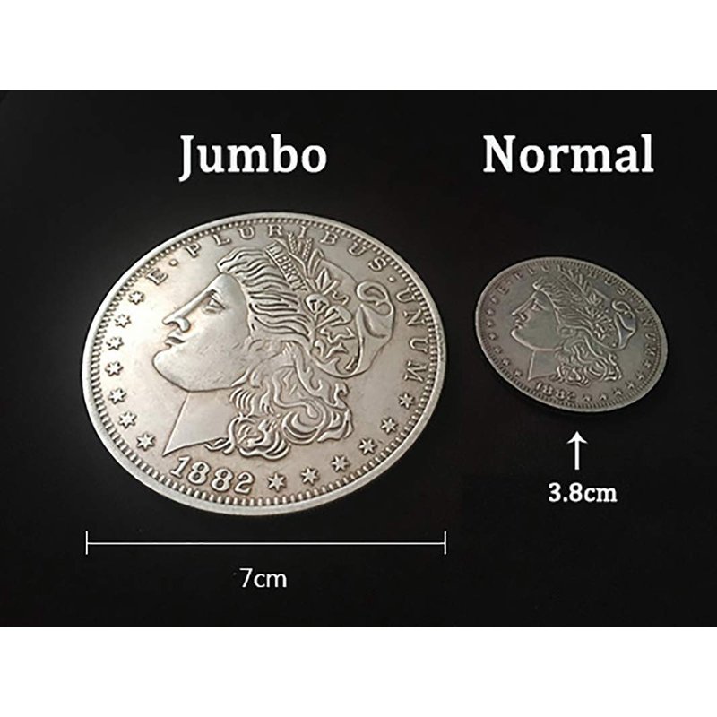 This jumbo coin is a beautifully crafted, made of brass and chromed imitation of the Morgan Dollar. It is a must have for any coin magician or collector.