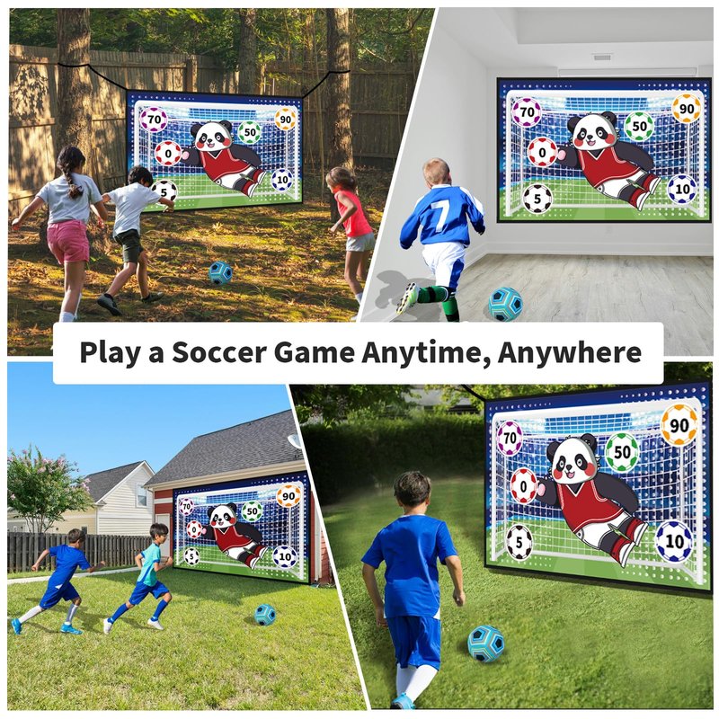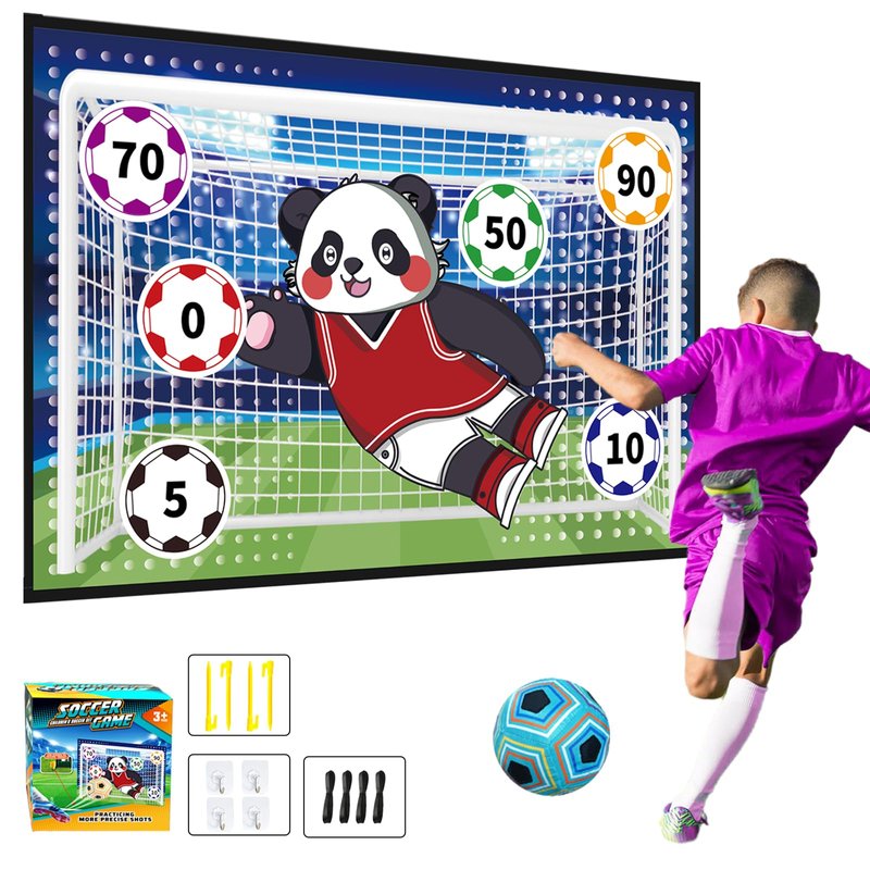 - 【New Soccer Games for Kids】-- This outdoor play equipment set includes a 59 X 39.37 in Soccer Game Target, a 6.3 in diameter sticky Soccer,4 Sticking Hooks,4 Ground Stakes, and 4 Ribbons. You can set it up on any flat surface or hang the game mat on the wall.The soccer games set is a great indoor and outdoor toy for kids over 3 years old and adults, suitable for beginners and skilled players to practice soccer.