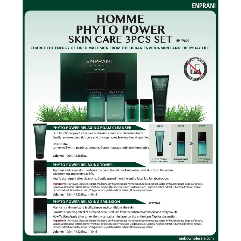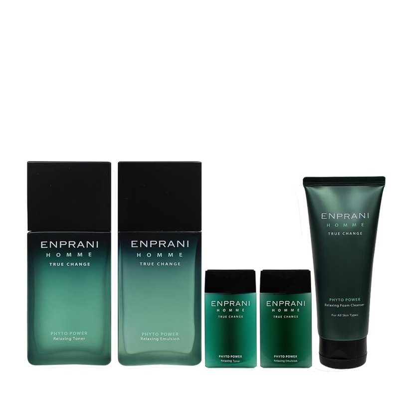 Men’s tired skin affected by the urban environment and daily life tends to lose more vitality over time.ENPRANI HOMME Phyto Power provides both soothing and revitalizing effects and makes men’s skin look younger with ingredients such as herb & berry complex rich in phyto chemicals. Get younger-looking skin with vitality every day.PHYTO POWER RELAXING TONER 125 mlThe toner revitalizes tired skin with its skin astringent and soothing effects [DIRECTIONS]After washing the face, apply an appropriate amount on the entire face and neck in the direction of skin texture.PHYTO POWER RELAXING EMULSION 125 mlThe lotion restores skin’s oil and moisture balance by providing soothing Phyto nourishing ingredients to rough, reddened skin[DIRECTIONS]Apply an appropriate amount on the entire face and neck in the direction of skin texture.PHYTO POWER RELAXING FOAM CLEANSER 100 mlThe foam cleanser, which can be used as shaving cream, removes dead skin cells and impurities from pores and soothes sensitive skin[DIRECTIONS]Dispense an appropriate amount on the palm and fully lather by adding a little water. Gently cleanse the skin by massaging in the direction of skin texture, and then wash off with lukewarm water. [CAUTION] For external use only. Keep out of reach of children. Do not use on damaged or scarred skin. Avoid contact with eyes.