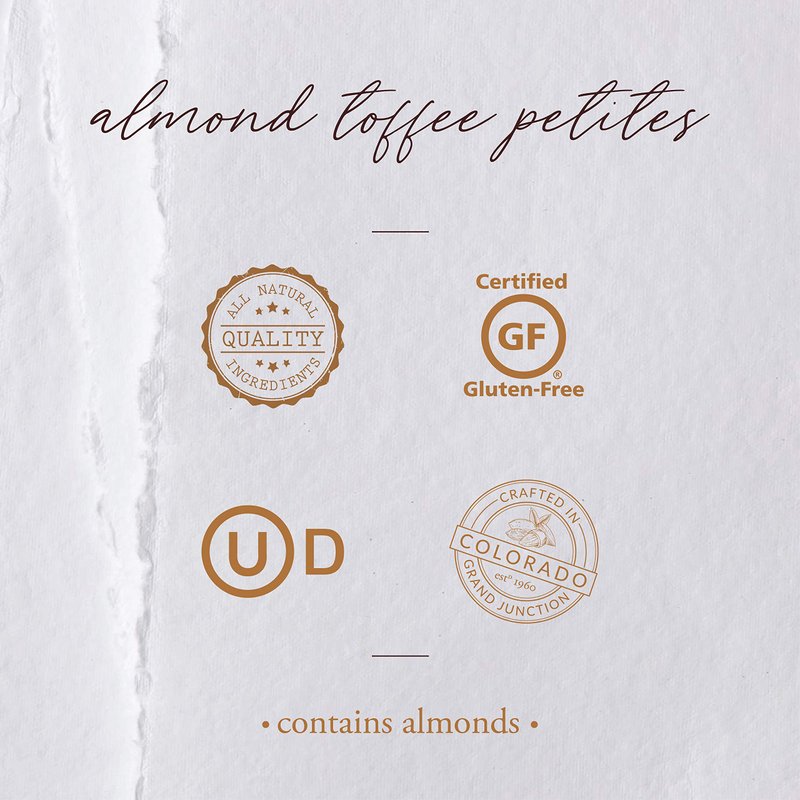 - ALMOND TOFFEE PETITES | The perfect blend of almonds, butter and pure cane sugar, fully enrobed in a generous layer of milk chocolate and sprinkled with crushed almonds, creates a buttery toffee with a delicate crunch