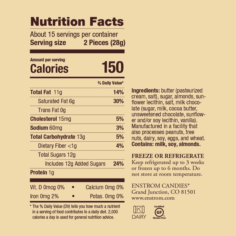 - CERTIFIED QUALITY | Enstrom's Almond Toffee is certified Gluten Free & Kosher Dairy and 100% Preservative free