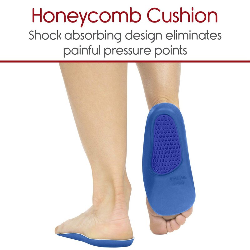 - 𝗦𝗛𝗢𝗖𝗞 𝗔𝗕𝗦𝗢𝗥𝗕𝗜𝗡𝗚 𝗛𝗢𝗡𝗘𝗬𝗖𝗢𝗠𝗕 𝗗𝗘𝗦𝗜𝗚𝗡: A unique honeycomb design allows the gel insoles to act like a spring, absorbing the shock of and evenly distributing the pressure created with each step. The honeycomb base also prevents the insole from slipping for a comfortable wearing experience.