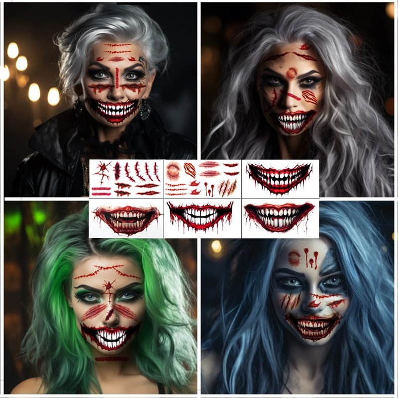 Get ready to scare and impress this Halloween with our Halloween Temporary Face Tattoos! This all-in-one tattoo kit includes a variety of halloween mouth tattoos, scary face stickers, and temporary big mouth tattoos designed to help you create the ultimate terrifying look. Perfect for anyone wanting to add a dramatic touch to their halloween scary makeup, these tattoos are ideal for adults looking to stand out at any Halloween party, cosplay event, or costume contest.