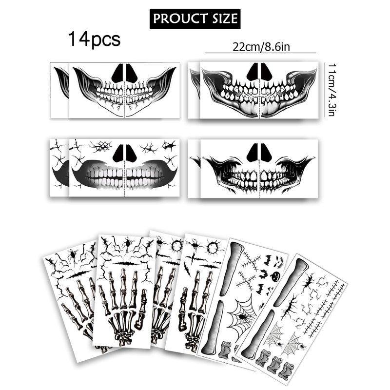 - Spooky Skeleton Face Tattoo: Transform your Halloween look with our realistic skeleton face tattoos. Perfect for any Halloween costume, these skull face tattoos are ideal for those wanting to make a bold, spooky statement.