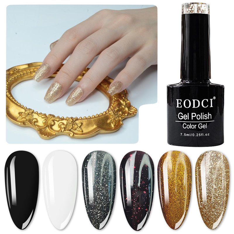 eodci 6 Colors Gel Nail Polish Set, 6 Colors Black White Gold Glitter Shimmer Summer Gel Nail Polish Kit Dark Green Soak Off Nail Polish Gel Polish Sparkle Gel Nail Art Gift for Women