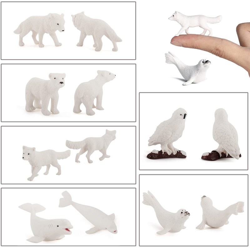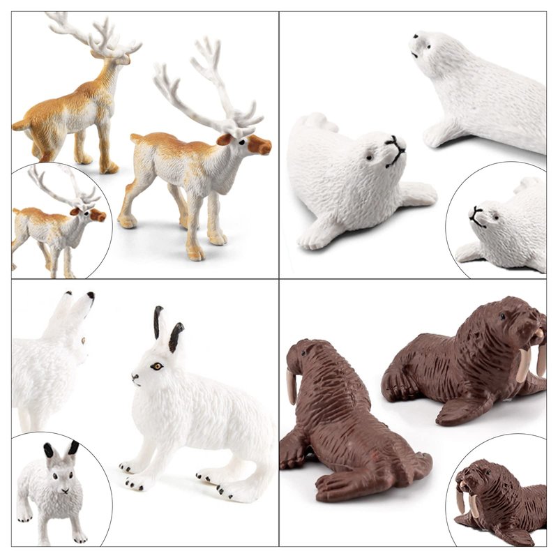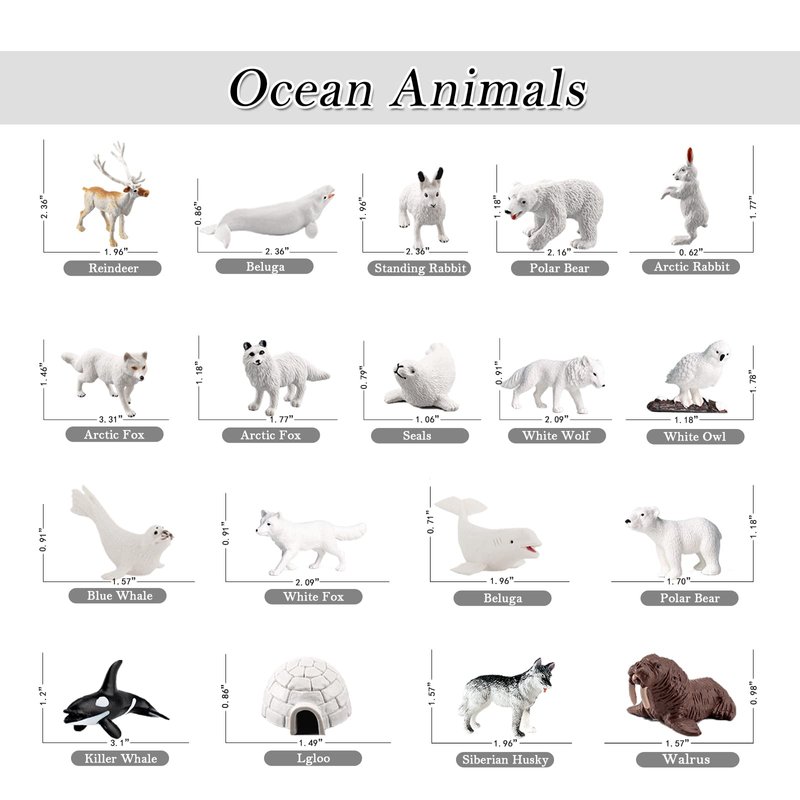 - Arctic Animals Big Party: 18 pieces small polar animal toys make up this set, including 2pcs arctic fox, 2pcs arctic rabbit, 2pcs arctic wolf, 2pcs polar bear, orca, walrus, snowy owl, reindeer, husky, 2pcs seal, 2pcs beluga whale and igloo model. Each polar animal figurines is in different sizes and poses, kids would like to have a party with different varieties of Arctic animal figures.