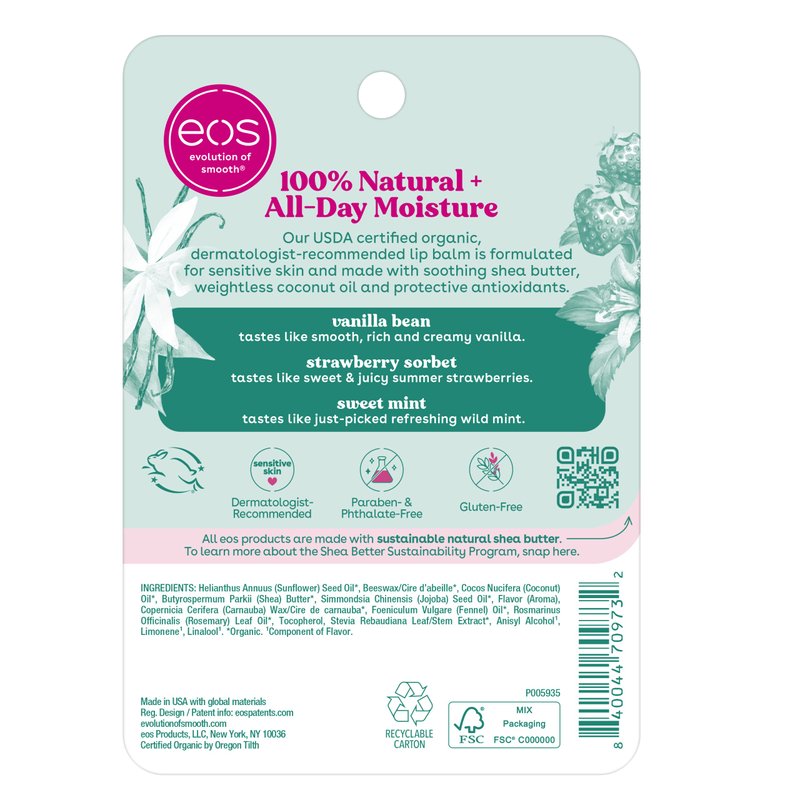 eos 100% Natural & Organic Lip Balm Trio- Vanilla Bean, Sweet Mint, & Strawberry Sorbet, Made for Sensitive Skin, Lip Care Products, 0.14 oz, 3-Pack