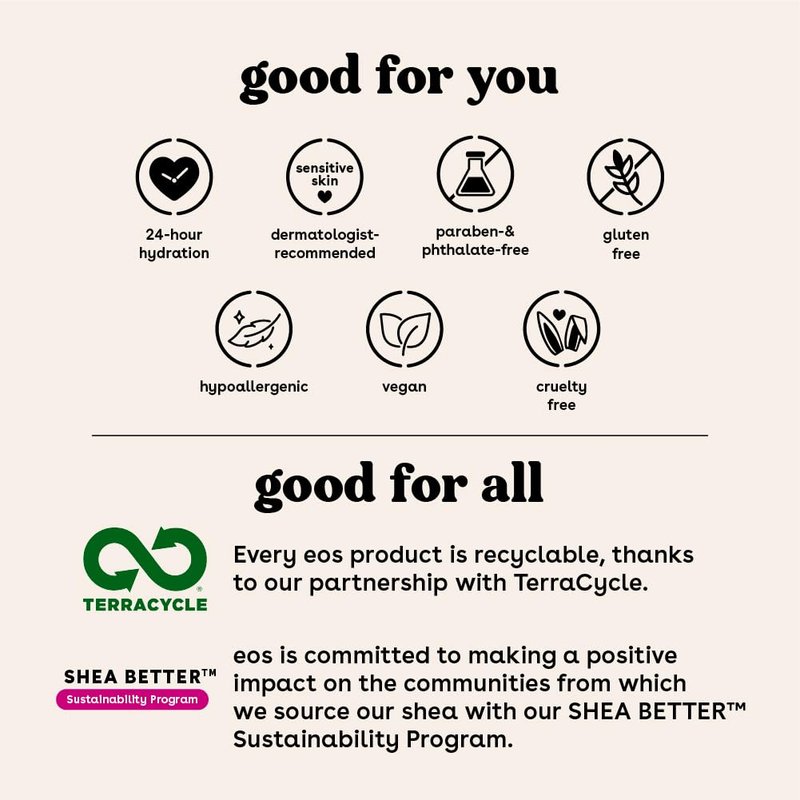 - ALL-NATURAL SHEA BUTTER: eos products have wild grown, sustainably-sourced 100% natural shea butter to make skin feel moisturized, protected and soft. We are paraben, phthalate and gluten free. Dermatologist tested. Vegan. Hypoallergenic. Cruelty-Free. No products tested on animals.