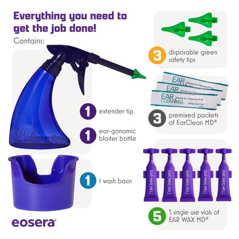 eosera® WAX BLASTER MD+ Cleaning Kit - Earwax Dissolver for Adults & Kids - Fast Acting, Doctor Recommended, Clinically Proven - Complete Irrigation Kit with 3 Ear Clean MD Packets & 5-ct Single Use Ear Wax MD Vials - Works in 15 Minutes