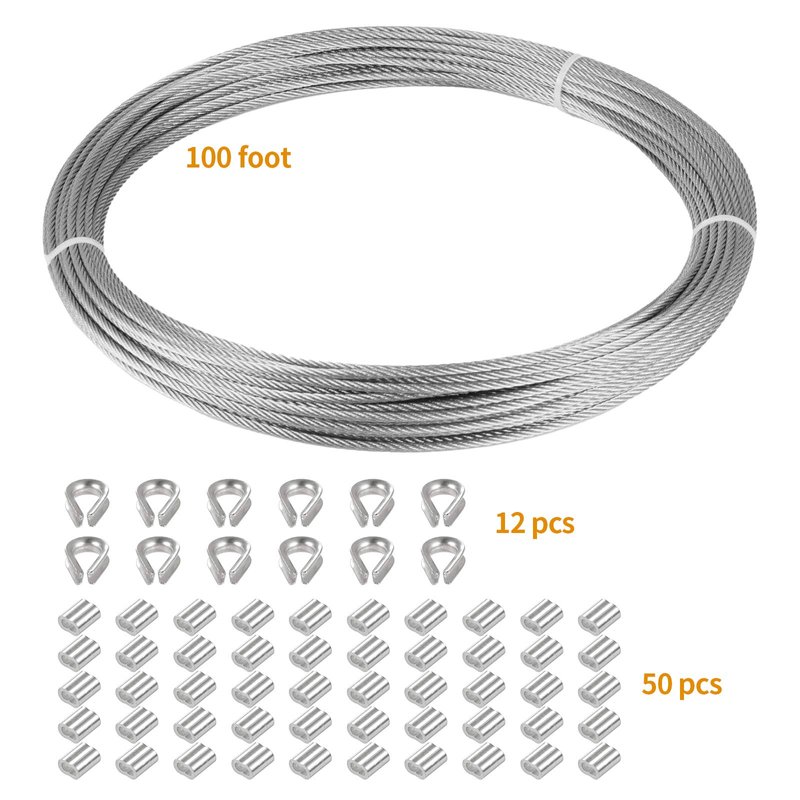 - Package Content: 100Ft 316 stainless steel cable rope, 50 pieces aluminum sleeves, 12 pieces thimbles.