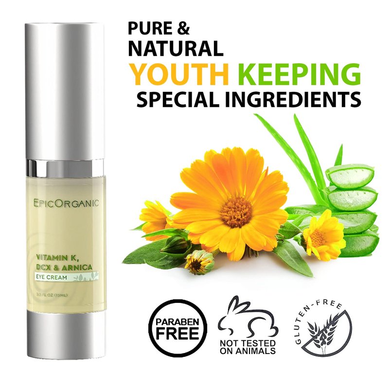 Epic Organic Eye Cream - Vitamin K & Arnica - Naturally Reduces Wrinkles, Under Eye Bags, Puffiness, Dark Circles & Fine Lines, Nourishes Around Eye Skin | 0.5oz