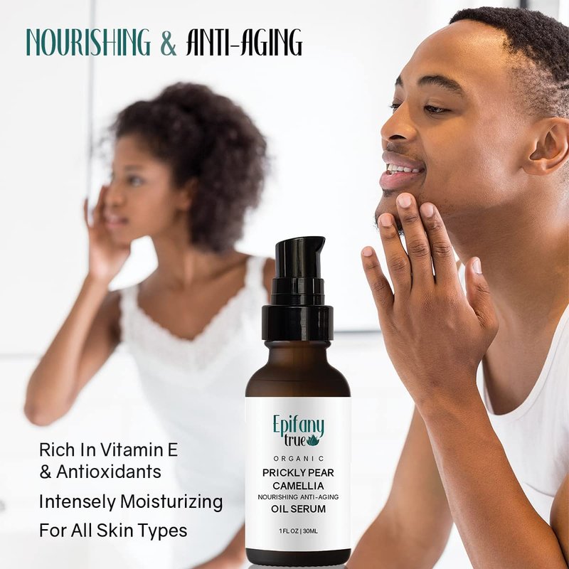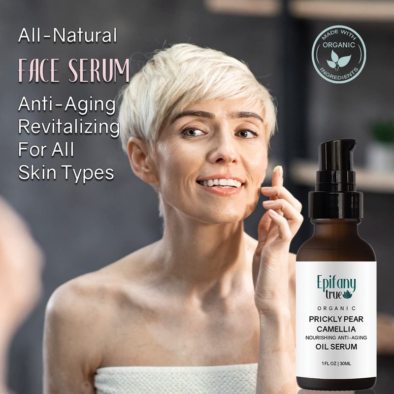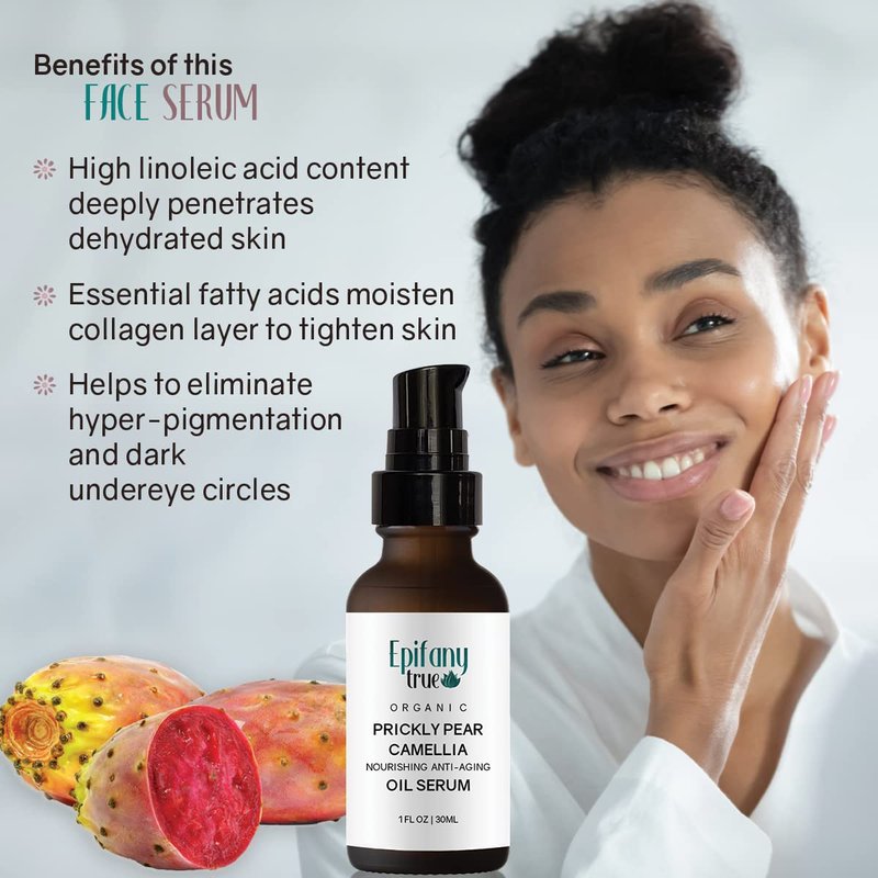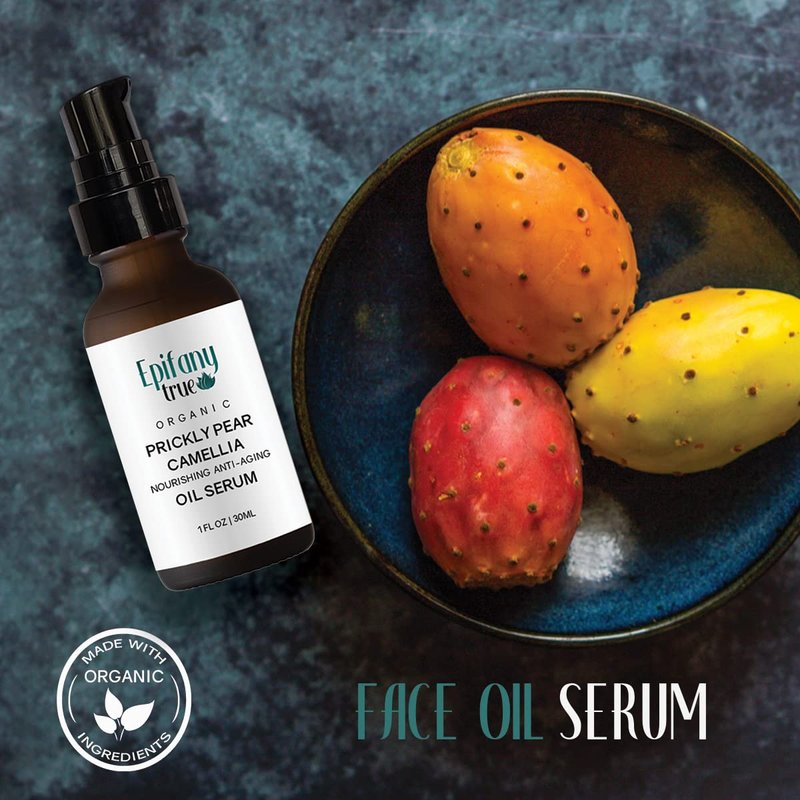 Epifany True Prickly Pear Camellia Face Oil Serum is an all-natural, unscented intensely moisturizing Vitamin-E-Rich face oil blend created to replenish very dry skin. Using this oil may help to retain moisture in the skin and promote smoother skin. Together, this carefully balanced blend of all cold-pressed certified organic Moroccan Prickly Pear Seed Oil, Japanese Camellia Seed Oil and Moroccan Argan Oil provides healthy and natural skin replenishing properties to may help address common skin concerns. We chose virgin organic cold-pressed Moroccan Prickly Pear Seed Oil as our main ingredient because it is known to have a very high concentration of Vitamin E and also Vitamin K. It has a light natural earthy, nutty scent. Suggested Use: After cleansing, apply a few drops of face oil serum to face and neck several times per week, preferably at bedtime, by gently massaging or patting into skin until absorbed.