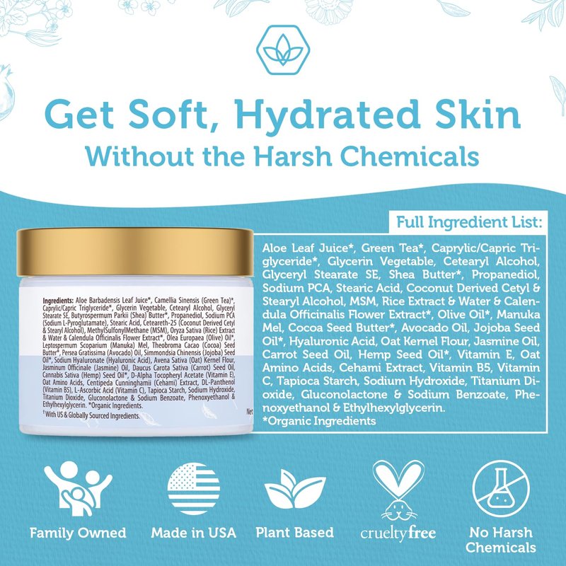 Say Goodbye to Dry, Dull Skin, Wrinkles, Acne and More Thanks to The Most Robust Face Cream Around. A lot of people want to have hydrated, healthier, more youthful skin but turn to cheap products or dangerous chemicals. But a lot of chemicals could actually be doing more damage to your skin. Most lotions dry your skin out with alcohol and coat it with petrolatum products to make it feel soft without actually helping the skin. That’s why we’ve formulated this advanced hydrating 16 in 1 face cream to nourish, repair, hydrate and rejuvenate your skin without the chemicals or cheap fillers. Ingredients Your Skin Will Love: We’ve combined a robust formula including: Aloe Vera, Coconut Oil, Cocoa Butter, Manuka Honey, Shea Butter, Blue Green Algae, Olive Oil, Jojoba Oil, Avocado Oil, MSM and Plumeria. Our ingredients are shown to: - Nourish with multiple sources of Vitamin A, B, C and E. - Deeply Moisturizer That Lasts Up To 12 Hours. - Boost Collagen Production, Strengthen Skin Fibers. - Restore Your Skin’s Natural Protective Barrier - Reduce Puffiness - Ease Fine Lines and Wrinkles - Prevent Premature Aging - Boost Recovery - Reduce Scars and Blemishes - Fight Acne, Blemishes and Breakouts Get Softer, More Youthful Skin. As a family owned company, results are everything to us. We take customer service and satisfaction quite seriously.
