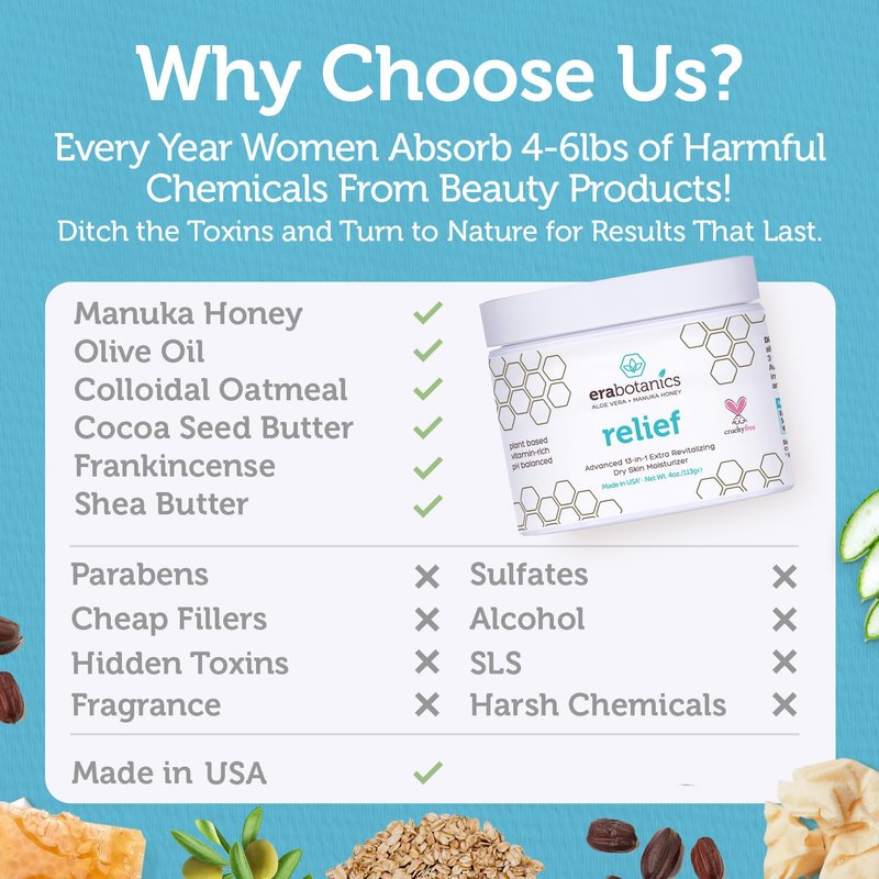 Finally Say Goodbye to Excessively Dry, Unhappy Skin Your search for the botanical Eczema and Psoriasis soothing moisturizer is finally over. You want the best for your skin. We want to give it to you. Nearly anyone can get nice skin if you know how to take care of it. Give your skin all the different vitamins, minerals and amino acids it needs for optimum care. Our powerful botanical ingredients include Aloe Vera, Manuka Honey, Shea Butter, Cocoa Butter, Blue Green Algae, MSM, Cehami Extract and Olive Oil. It’s Superfood for Your Skin. What Can You Expect From Relief: Soothe, Moisturize and Nourish Reduce Dryness and Appearance of Redness Support Your Skin’s Natural 5.5 pH Moisturize For Hours Hydrating Nourishment For All Types of Damaged Skin: Eczema Psoriasis Rosacea Dermatitis Irritated Skin How Does Relief Work So Well Our formula is specially designed to work with your skin’s natural biology to restore its ideal moisturized balance with no harsh chemicals. Be Truly Comfortable In Your Own Skin We know how difficult it is to find a product your skin loves. That’s why we worked to create a product as safe as it is effective. Light, Non-Greasy Formula Won’t Clog Pores Fast Absorption, No Residue Without Paraben, Fragrance, and Steroids No Fillers or Harsh Chemicals