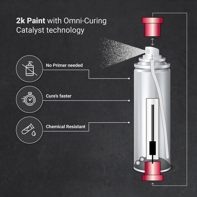 Our spray paint is not typical rattle can paint: it is formulated as a 2K paint - which means a catalyst is introduced into the paint at application which creates a chemical reaction that causes the paint to quickly cure with a very hard surface.