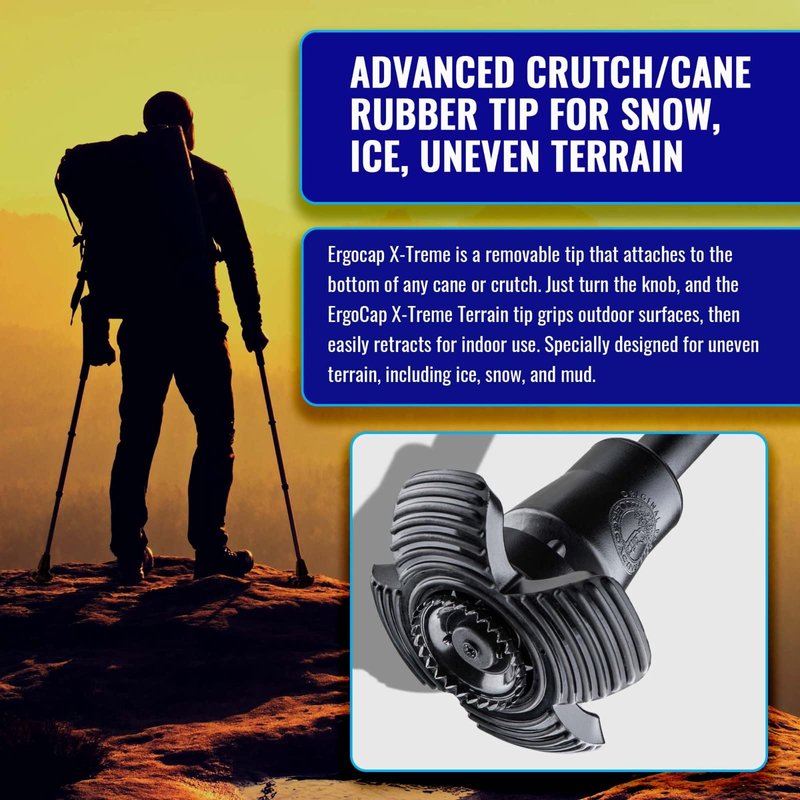 - Using a cane or crutches is challenging enough. Having to get around in wet and slippery conditions can be a formidable task. Now you can avoid slipping with the innovative ErgoCap X-Treme Terrain—a removable tip that attaches to the bottom of any cane or crutch. Just turn the knob, and the ErgoCap X-Treme Terrain tip grips outdoor surfaces, then easily retracts for indoor use.