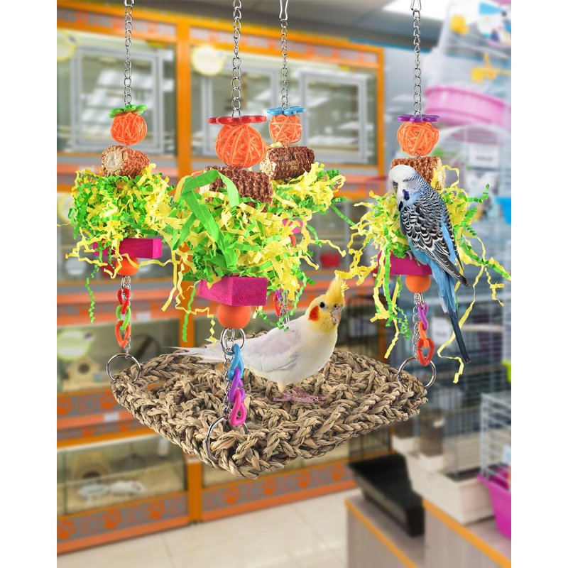- Happy time :Our bird seagrass foraging wall will give your bird friends a happy playtime. When you sent this lovely bird toys for parakeets to your friends' house,your bird friends will crazy for it,biting off papers for great fun,swinging and climbing on seagrass net,chewing this or that happily.