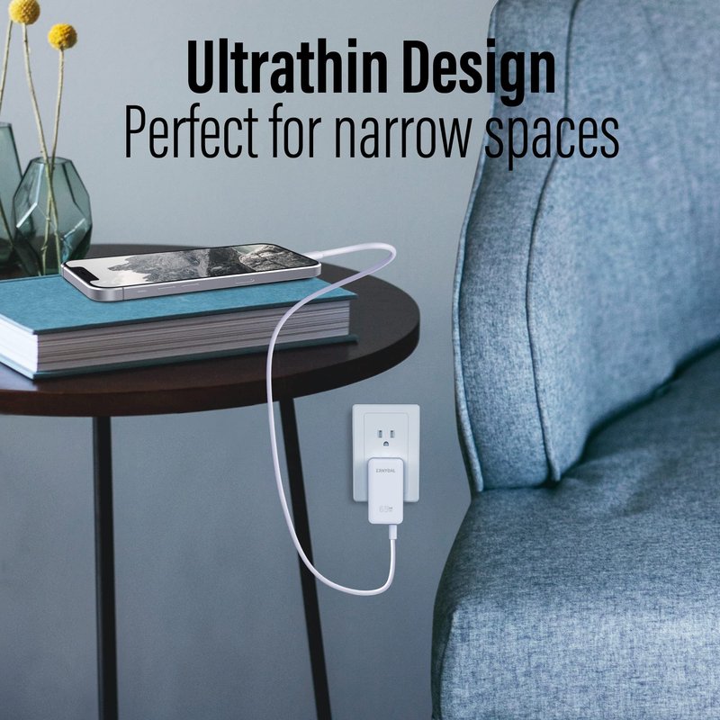 - Ultra Thin: The 65w usb c charger only 0.55 inches thick, smaller than bank cards, compact and portable, easy to carry during travel; Home use does not take up space and is very convenient to plug into the sockets in the kitchen, behind the sofa, or on the walls of the room