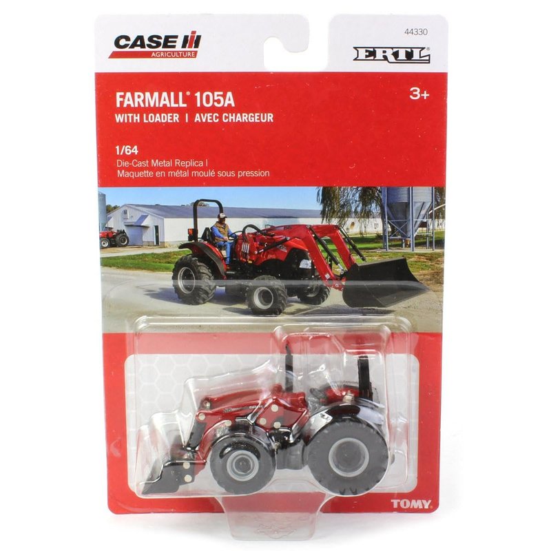 This 1/64 scale Farmall 105A Tractor with Loader is made by ERTL. Designed for Case IH fans ages 3 years and older, this tractor features a poseable front loader and an open station configuration with fenders. Other features include soft feel PVC tires, an upright muffler and die-cast metal parts. Its rear hitch is compatible with most 1/64 scale ERTL implements and accessories. According to the manufacturer, this toy is recommended for ages 3+ years, making it great for play and display!