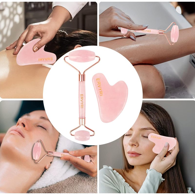 ERVYRI Jade Roller and Gua Sha Set - Rose Quartz Face Roller Skin Care Gua Sha Facial Tools , Face Massager for Women, Relieve Stress, Remove Wrinkles Eye Puffiness-Pink