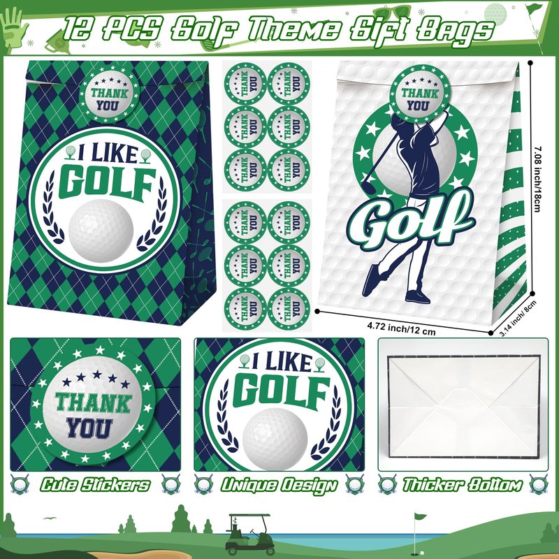 Golf party favors includes 12 PCS Slap Bracelets(12 styles), 12 PCS DIY Stickers(4 styles), 12 PCS Temporary Tattoos, 12 PCS Keychains(6 styles), 12 PCS Plastic Straws(6 styles) and 12 PCS Gift Bags(4 styles). Enough quantity to meet your party need.