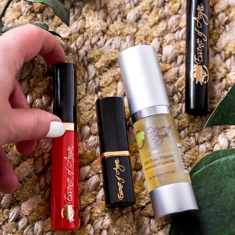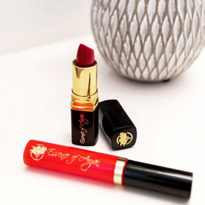 Essence Of Argan Lip Care Bundle - Moisturizing Deep Red Lipstick & Nourishing Lip Gloss with Organic Moroccan Argan Oil - Voluptuous Sexy Lips - Sun Protection, Long Lasting & Colorful Lip Balm Set…