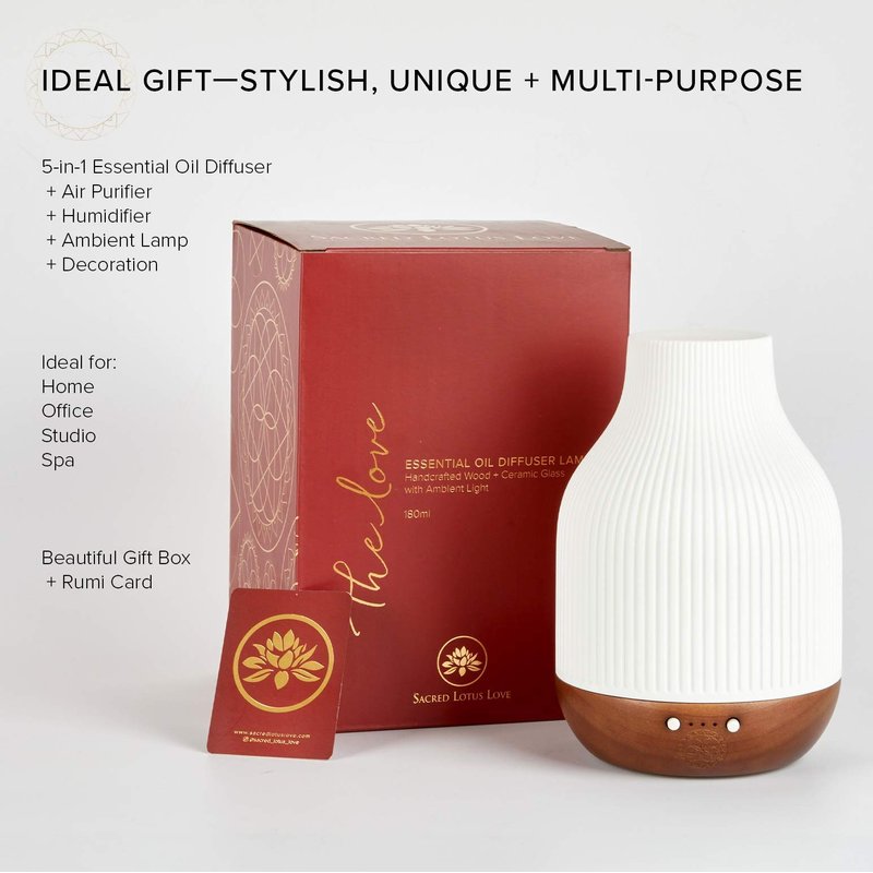 - HIGH-QUALITY essential oil diffuser, and also a stylish, minimalistic lamp. The ambient light creates a beautiful atmosphere that is fully customizable with 5 light controls including soft, bright, breathing, sleep helper + on/off. The natural wood base is engraved with a subtle Love Anahata Symbol.