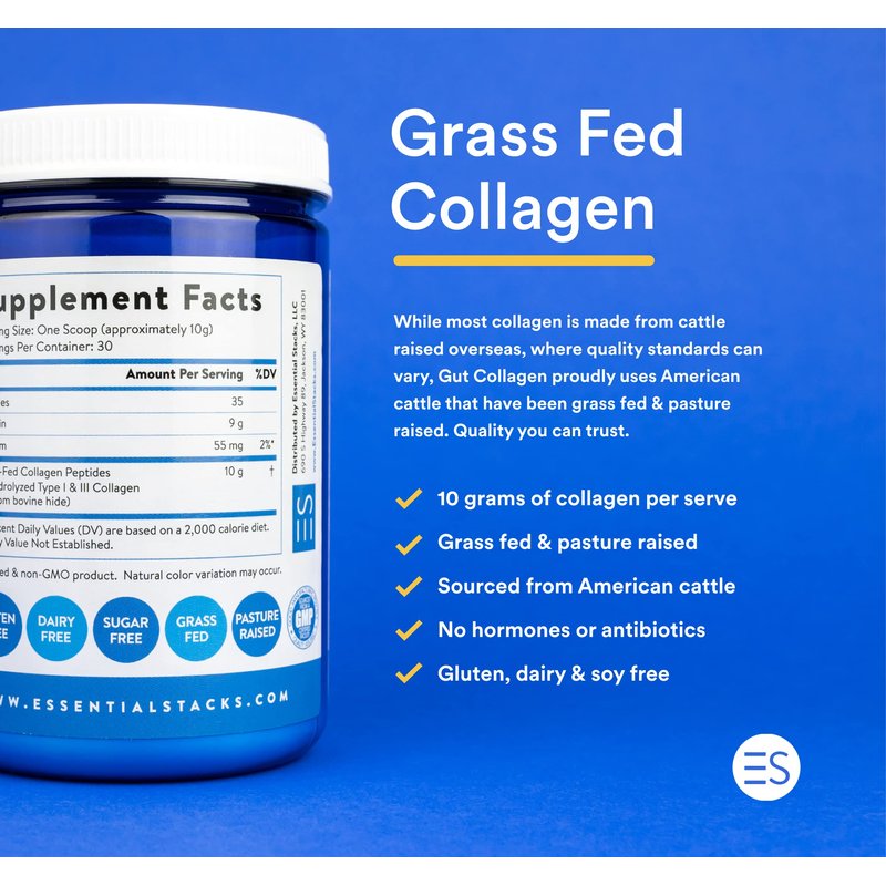 Essential Stacks Collagen Peptides Powder (from Grass Fed American Cattle) - Gluten, Dairy & Soy Free - Unflavored Hydrolyzed Collagen Supplement (10.6 oz)