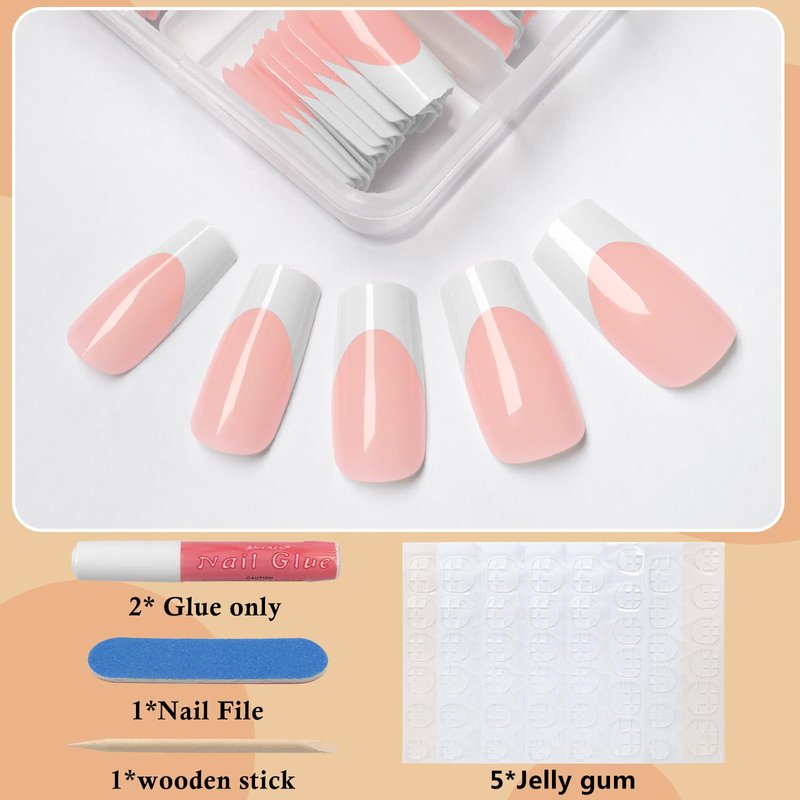 - Gel French Tip Nails: Summer press on nails french design nude fake nail kit comes with 120 pieces of medium length nude square fake nails, 5 sheets of nail adhesive tabs, 2 pieces of nail glue, 1 mini nail file, and 1 wooden stick. These press on nails are the easiest way to achieve a salon look without spending money or time on a visit