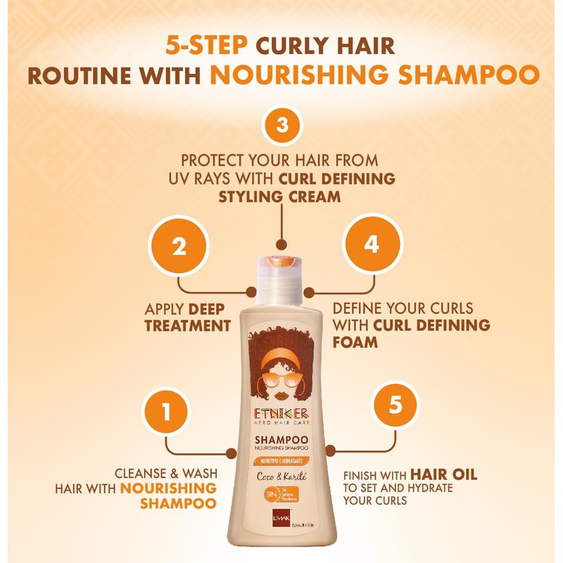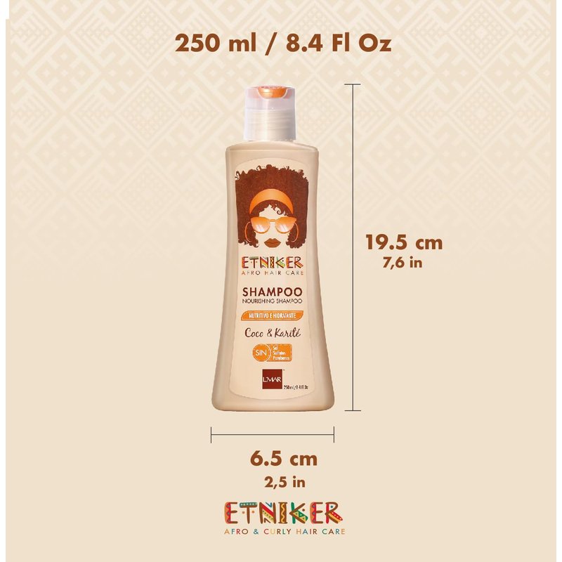 Introducing Etniker Nourishing Shampoo by L’mar, the perfect solution for those with curly or wavy hair looking to restore and moisturize their locks. Our shampoo is formulated with a unique blend of natural ingredients, including coconut and shea butter, which work together to nourish and hydrate your hair, leaving it feeling soft, shiny, and healthy. Say goodbye to harsh chemicals and damaging sulfates with Etniker Nourishing Shampoo. Our formula is free from salt, sulfates, and parabens, making it gentle on your hair and scalp. It is specially designed to cleanse your hair without stripping it of its natural oils, which are essential for maintaining healthy, bouncy curls. Our shampoo is ideal for those with curly textured hair, which is more prone to dryness and breakage. The natural oils in our formula work to nourish and restore moisture to your hair, while shea butter helps to detangle and minimize future breakage. Use our shampoo in conjunction with our Deep Conditioning Mask for maximum effectiveness, which boasts a hearty blend of natural oils such as coconut, shea butter, and monoi oil. Etniker Nourishing Shampoo is easy to use. Simply massage gently into your scalp and wet hair, then rinse thoroughly with lots of water. For best results, follow up with our Curl Defining Styling Cream, which is formulated to deliver defined and softly held curls, helping you to create any desired hairstyle. We are proud to offer a shampoo that is free from sulfates, salt, silicones, mineral oil, and parabens, and that combines natural and hydrating active ingredients such as coconut extract and shea butter. Whether you're looking for a moisturizing shampoo, shampoo for curly hair, coconut shampoo and conditioner, or a shampoo and conditioner for curly hair, Etniker Nourishing Shampoo by L’mar is the perfect choice. In summary, Etniker Nourishing Shampoo by L’mar is the perfect solution for those with curly or wavy hair looking to restore and moisturize their locks.