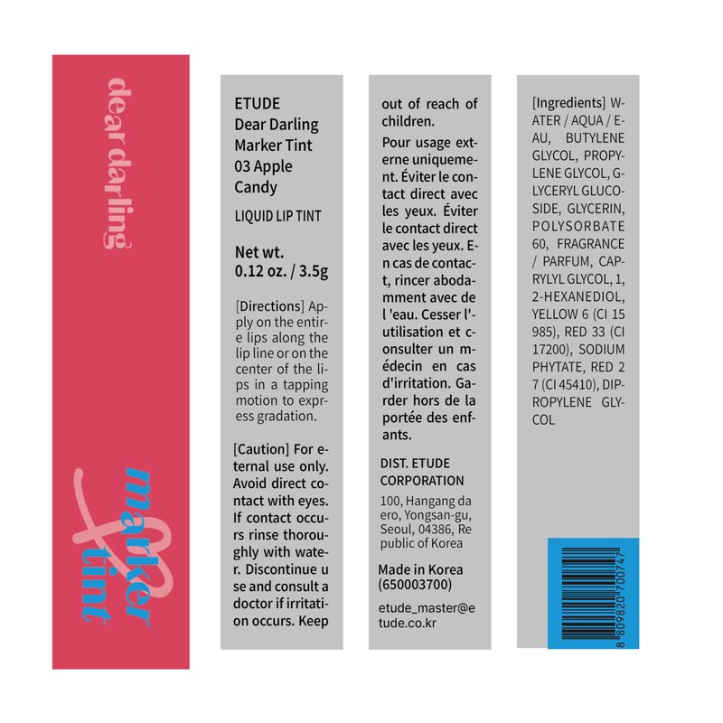 ETUDE Dear Darling Marker Tint #3 Apple Candy | Hydrating & Long Lasting Lip Stain | High Pigmented Lip Maker with Easy Drawing Tip | Korean Daily Lip Tint, Korean Makeup, Kbeauty, Perfect for Gift