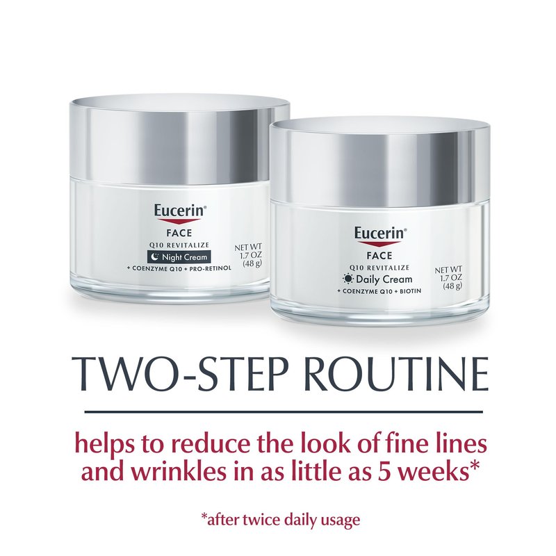 - Includes one (1) 1.7 ounce jar of Eucerin Q10 Anti Wrinkle Face Cream and one (1) 1.7 ounce jar of Eucerin Q10 Anti Wrinkle Night Face Cream
