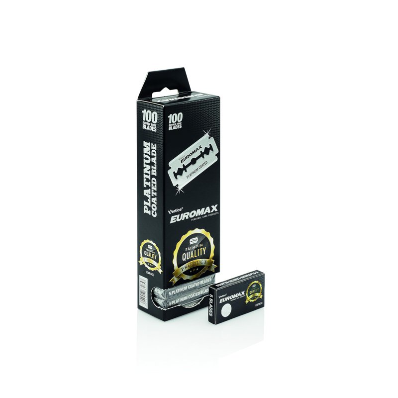 Euromax Blades. Made from Japanese Steel and platinum coated for optimum edge strength and longer blade life. Fits all standard safety razors. Great for professional and home use. Manufactured in India. 20 packs of 5 blades each 100 Blades total Made in India