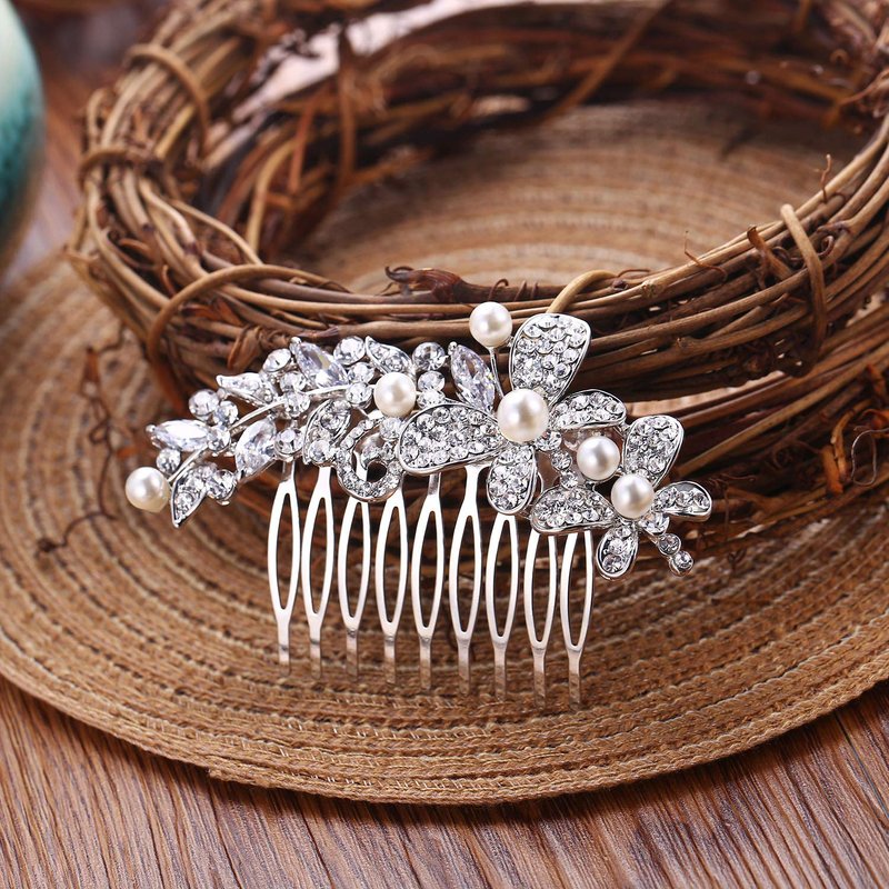 EVER FAITH Wedding Hair Comb CZ Austrian Crystal Cream Simulated Pearl Butterfly Flower Bridal Hair Clips Accessories for Brides Bridesmaids Clear Silver-Tone