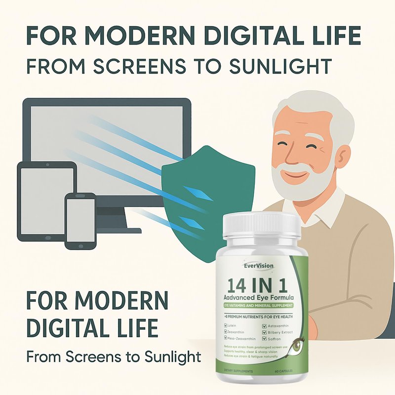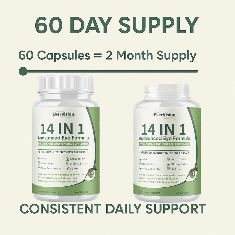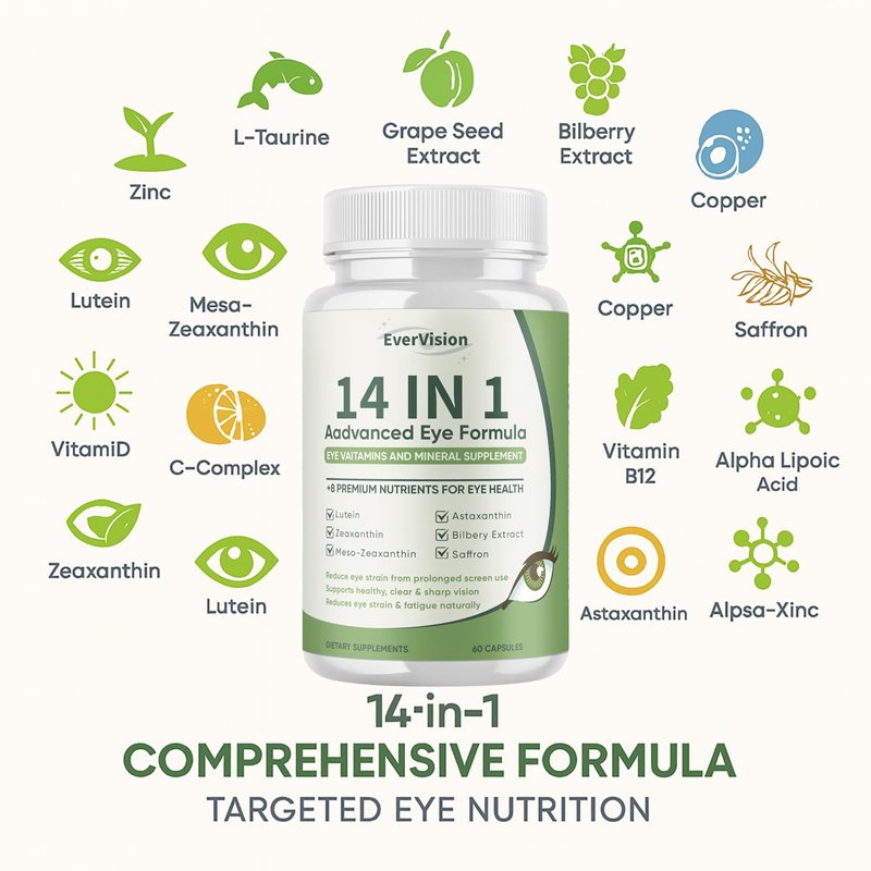 Evervision 14 in 1 Advanced Eye Formula - Eye Vitamin and Mineral Supplement with Lutein, Zeaxanthin, Astaxanthin, Bilberry Extract & Zinc, Eye Health Pills for Adults & Seniors - 60 Capsules