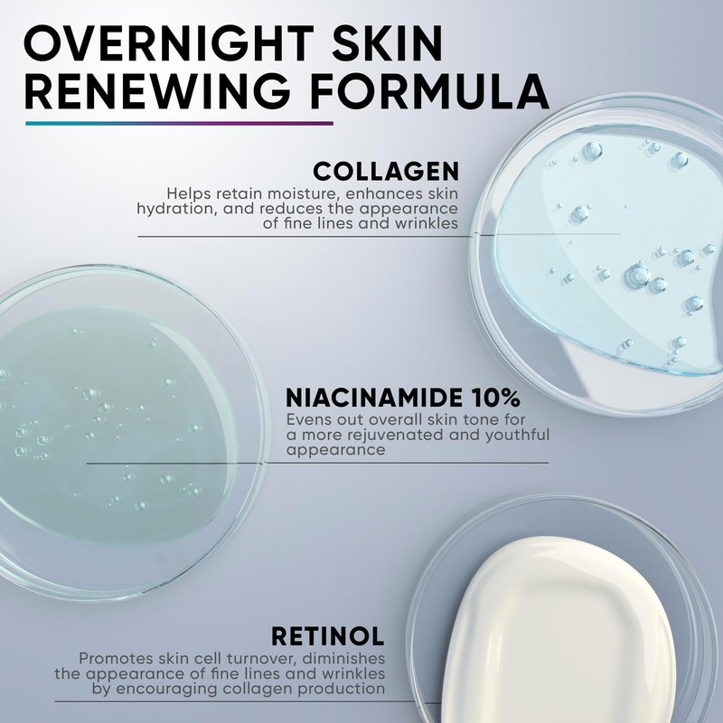 Indulge in the luxurious revitalization of our fragrance-free retinol night cream. Specifically designed for women, this powerful formula with 10% niacinamide, collagen, and retinol works while you sleep, revealing a visibly refreshed and youthful glow in the morning.