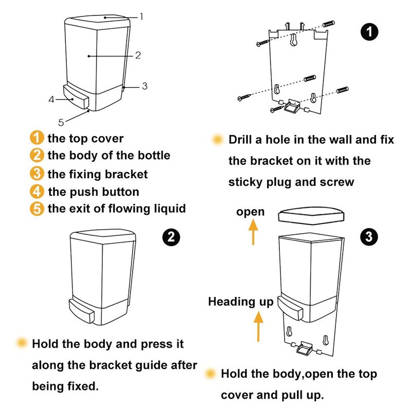 - Wall Mounted Soap Dispenser--- Easy to mount with strong but removable easy to clean & easy to refill, simple lift the lid and pour in the liquid.