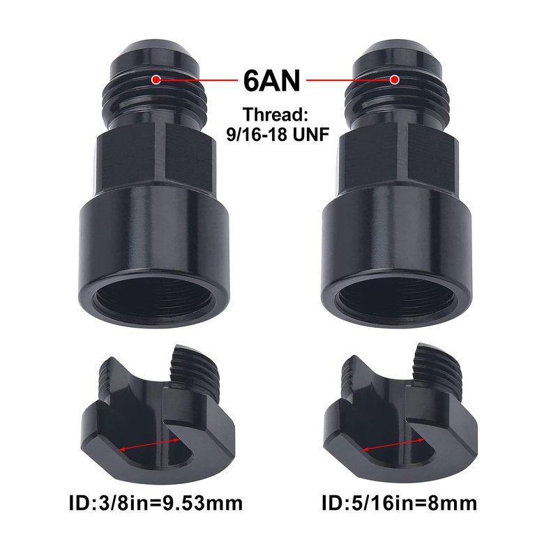 - [Size] The thread size of 6an is 9/16-18UNF. The ID of the screw is 3/8 inch and 5/16 inch.